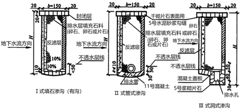(2)渗沟有填石渗沟、管式渗沟、洞式渗沟、边坡渗沟、支撑渗沟等。